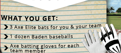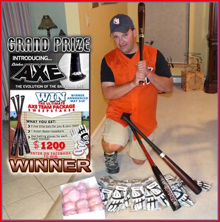 Back on May 1st or 2nd I was up late serving the web and I happened to see an advertisment for a contest that Baden Axe Bats was having for there Axe Team Package, For whatever reason I decided to throw my name into the contest. I really can't tell you why I did, because I never win anything or I figure that there's some hidden fee or requirments.Well the week before I had entered the contest I broke my pink bat from Sandlot Stiks and in memory of my siister. So I was using my composite bat from Viper Bats and in a game the following week I swung on an inside pitch and puit a crack int the fiberglass. I signed up for the contest without considering I had broke two bat in the last week. I decided to buy a new Viper Bat and after considering what I was going to get I just asked good his opinion and i was about to place my order when I decide to check my email. Low and Behold I was an email claiming that I was the Grand Prize Winner. I was super extatic and interested in trying out these unique bat handles. So still not a 100% believing that I actually won I went through picking out what I wanted and awaitied my award in the mail. Sure enough about a week later I recieved my package and to say I was impressed is an understatment. Only one other time did I ever think to myself I don't want to use this bat because it's more a work of art then a baseball bat. Then there was the unique bat handle but I picked up and it felt like I had always use this unique design, it was a little bit awkward but after a couple of swings I felt like this design was completely natural and felt like my hands were getting through the swing quiicker. I'm so pleased and happy with winning this prize package and am sold on this unique handle design.