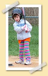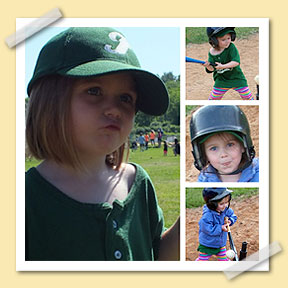 Our other concern was Maeve “Peanut” Conlon . She was this little bit of thing that didn’t speak til the last game (even though according to her mom talks a mile a minute at home) and I actually think that most of our bats were bigger than her. She was very timid and I was afraid she would not be mature enough to handle T-Ball or didn’t have the skill and could get hurt. Surprisingly her timidness was not an issue she was the cutest thing and listened to all my instruction and tried really hard each and every game. I made her season early on as I took a special interest in giving her extra attention and help and when I discovered she couldn’t hold up any of the bats I gave her a wooden bat that was extra small and Aiden was to big for. She had such a smile on her face that it made me think of my sister and her love of baseball and how much I missed her. She did have difficulty in the field but all and all she tried really hard and was so cute to watch play. She also made this face (her Angry Face) when I wanted her to focus and I knew she was ready to hit. When we started to pitch to everyone we weren’t sure Maeve was ready for that, but after the second time doing this we decided to give her a shot, at first she had a tough time but by the end of the season she had hit twice being pitched to. The funny thing about this is that the first time she got a hit being pitched to I was so excited and let out such a yell that I actually scared her.